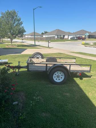 5x8 tilting trailer, wood slats are perfect and tires are perfect plus new spare tire mounted on side. Fenders and lights all perfect as well… great little trailer. Title in hand