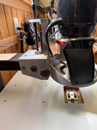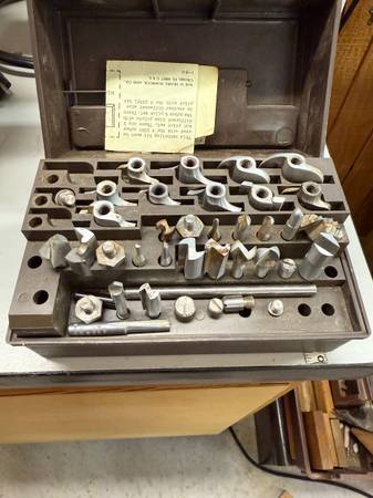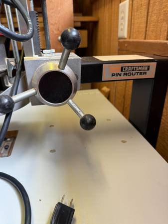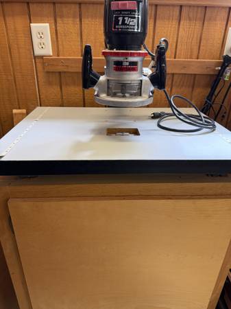 This vintage Sears pin router table comes with a starter steel router bit set, accessories and user manuals. You will need to buy a round base router (see HP recommendations on the internet) since the old router shown is too old for me to include. Also, you may wish to add a few longer lasting carbide bits especially if hardwood cutting. Pin routing is fun and useful for making multiple copies of wood crafts such as plaques, mirror frames, small shelves, wooden toys, silhouettes, holiday decorations, signs and much more. One wooden particle board plaque template plus several designs for making additional templates are also included. Templates can be attached to your project wood using double sided tape or hot glue for routing. A pin router can also be used to shape wood edges just like an ordinary router table by securing a straight edge to the table top. Table size is 27"L x 20"D x 19"H. The old router and cabinet shown in the photos are not included. As with any tool it is very important that you follow each of the setup, usage and safety instructions shown in your router and in this router table’s manuals. Free.